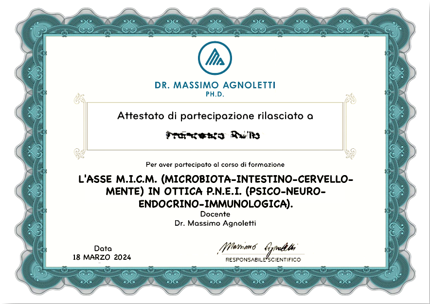 "Il corso spiega con immediatezza pratica le implicazioni delle ricerche scientifiche sull'asse M.I.C.M. e consente di sviluppare sin da subito strategie operative per promuovere benessere nella vita di pazienti e clienti. Consiglio vivamente il corso a tutti i professionisti della salute che vogliano operare nel rispetto di criteri di complessità e integrazione disciplinare.".