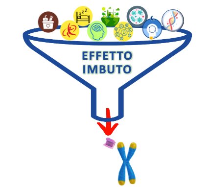 L'“effetto imbuto” dei telomeri descrive la convergenza, parziale indipendenza ed equivalenza dei nove principali fattori (nutrizionali, motori, psicologici, ecc.) sui telomeri, le strutture cromosomiche che rappresentano il nostro orologio biologico perché determinano la nostra longevità e la nostra qualità di vita globale.