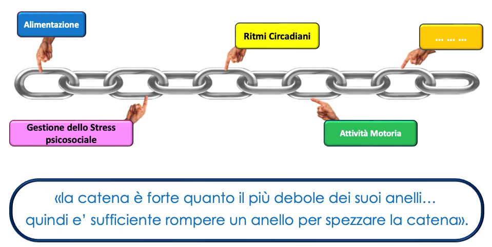 L’intervento dei professionisti dovrebbe invece tendere a “rinforzare” l’anello o gli anelli più deboli per raggiungere almeno un grado di sufficienza (pensiamo, ad esempio, ad un minimo di qualità del sonno o di attività motoria) ma non avere come obiettivo quello di “eccellere” in uno o più fattori a scapito di altri (si pensi ad esempio al caso in cui una persona aumenta significativamente la propria attività motoria ma contemporaneamente comincia ad alimentarsi scorrettamente).