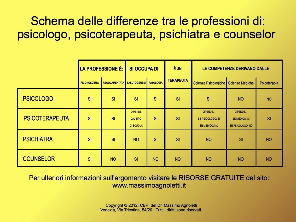 Ho riportato qui uno schema riassuntivo relativo le principali differenze tra le quattro più diffuse professioni riconosciute per legge in Italia che trattano, a vario titolo, il benessere psicologico. Con il beneficio del dubbio ho incluso nella tabella anche la figura del counselor benché ad oggi (Gennaio 2014) risulta ancora controversa la questione se considerare o meno il counselor una figura professionale riconosciuta (vedi legge 4/2013 “Disposizioni in materia di professioni non organizzate” ).